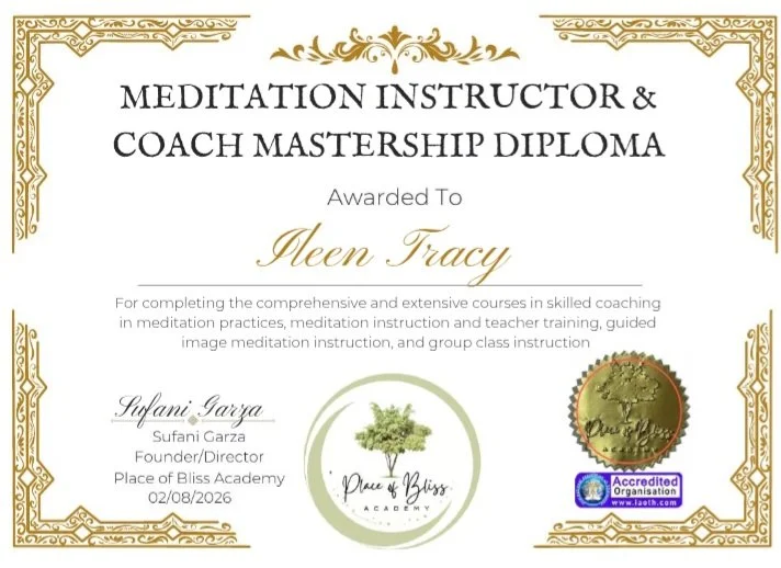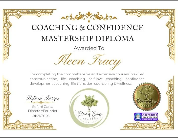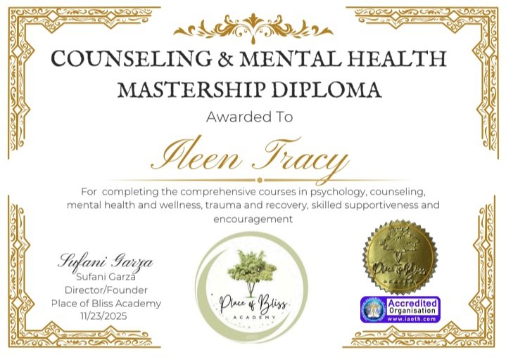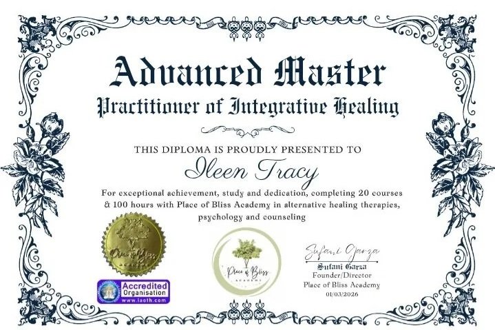 Ileen has received multiple diplomas from Place of Bliss Academy (an accredited organization through the International Association of Therapist). The diplomas include Advanced Master Practitioner of Integrative Healing, Counseling and Mental Health Mastership Diploma, Meditation Instructor and Coach mastership diploma, and Coaching and Confidence Mastership Diploma. along with a hand full of certificates in verity of topics.